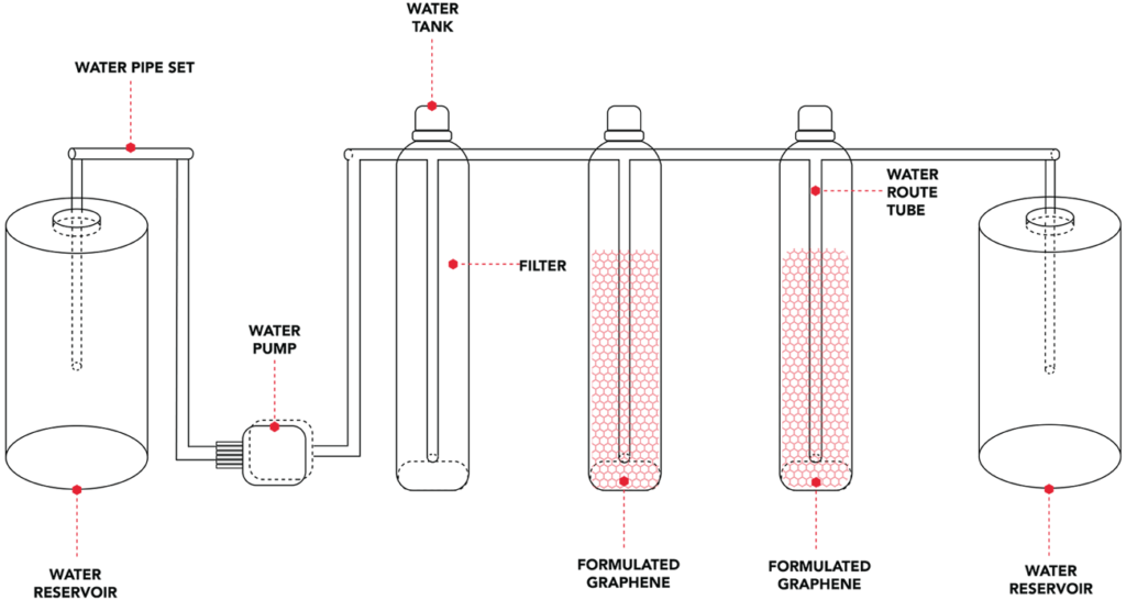 กราฟีนสามารถช่วยลดระดับค่าความเน่าเสียของน้ำที่เกิดจากสารเคมี(C.O.D) และค่าปริมาณน้ำมันที่ปนเปื้อนที่อยู่ในน้ำเสีย (F.O.G) วิธีการกรองที่ถูกต้องจะสามารถลดปริมาณสารแขวนลอยลงได้อีกด้วย ระบบไส้กรองกราฟีนแบบแยกส่วนนี้ช่วยลดเวลาการบำบัดตั้งแต่ต้นจนจบ โดยโรงงานสามารถประยุกต์เข้ากับอุปกรณ์การบำบัดเดิมที่มีอยู่ได้ อุตสาหกรรมที่เหมาะสมที่สุดสำหรับระบบบำบัดนี้คืออุตสาหรกรรมที่มีค่าC.O.D, F.O.G และสารแขวนลอยจำนวนมาก